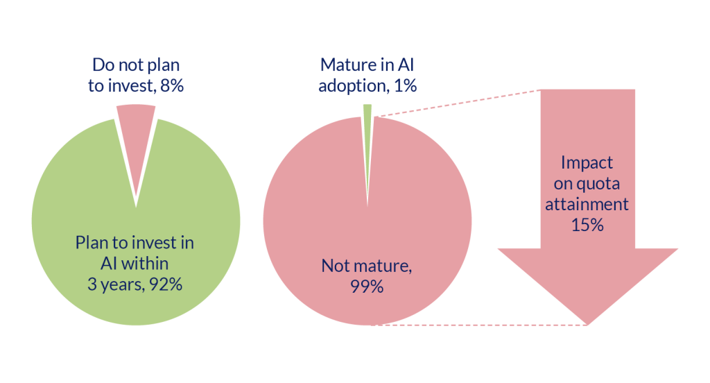 AI is no longer something to think about next year — it’s already reshaping the way buyers and sellers operate. Yet, while 92% of companies plan to invest in AI within the next three years (McKinsey), only 1% consider themselves mature in AI adoption. And sales teams that fail to integrate AI-powered sales intelligence and personalised enablement risk falling 15% behind in quota attainment (Forrester).